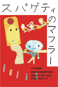 | うえのよう個展 「スパゲティのマフラー」 2025年11月27日(木)-12月9日(火) 12:00-20:00 最終日18:00まで 水曜休み ゆで卵を胸ポケットに入れて 手のひらをふさふさにして スパゲティのマフラー 100本ほしいな うえのよう 絵本作家として活動しながら、漫画、粘土作品、アニメーションなどを制作、発表している。 季刊フリーペーパー「イモマンガ」のメンバー。 HP: http://uenoyo.info Instagram: @uenoyoo |